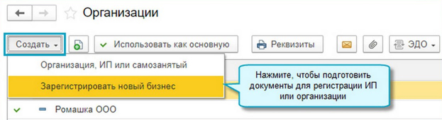 В «1С:Бухгалтерии 8» начиная с версии 3.0.149 добавлена возможность подготовить и отправить в ИФНС документы по регистрации нового бизнеса — ИП или организации. Чтобы сразу из программы отправить документы, потребуется усиленная квалифицированная электронная подпись.